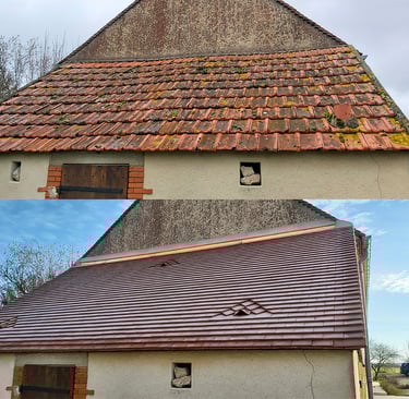 DG Rénovation, couvreur dans l’Indre, réalise réparation de toiture, remplacement de tuiles, recherche de fuite, nettoyage et démoussage de toiture.
